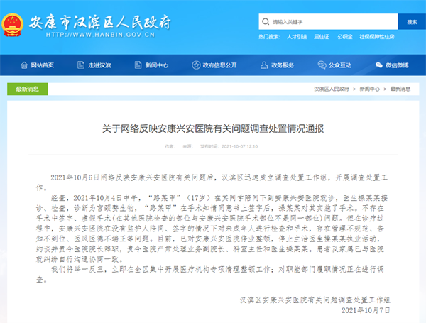 2021年10月6日網(wǎng)絡反映安康興安醫(yī)院有關問題后,漢濱區(qū)迅速成立調(diào)查處置工作組,開展調(diào)查處置工作。