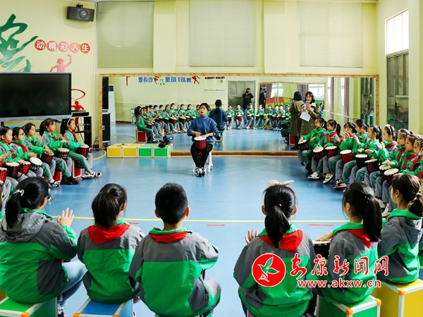 “同學(xué)們好,經(jīng)過(guò)前面的學(xué)習(xí),大家已經(jīng)熟練地掌握了非洲鼓低音和中音的打法,今天我們一起來(lái)學(xué)習(xí)高音的打法,打高音時(shí)手指自然張開,但不要張的很大,在打擊時(shí)要······”10月14日下午16:20,漢濱區(qū)果園小學(xué)非洲鼓社團(tuán)汪倩老師正在教學(xué)生非洲鼓演奏,孩子們熱情專注地拍打,富有節(jié)奏感的鼓聲飄蕩在校園上空。這是該校落實(shí)“5+2”模式素質(zhì)拓展服務(wù)的一個(gè)縮影。