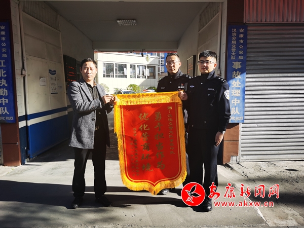 本網(wǎng)訊(記者 唐正飛)11月9日,中心城區(qū)安康市公安局漢濱分局交警大隊(duì)事故處理中隊(duì)門口,安徽籍市民燕明輝一行將一面印著“勇于擔(dān)當(dāng)作為,優(yōu)化營(yíng)商環(huán)境”的錦旗送給辦案交警手中。