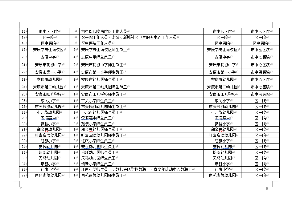 漢濱區(qū)老城街道、新城街道轄區(qū)重點(diǎn)人群:一是黨政機(jī)關(guān)、企事業(yè)單位返崗人員,中小學(xué)校、幼兒園返校人員;二是“五一”假期有市域外旅居史人員;三是41類重點(diǎn)人群;四是市域外來(lái)安返安核酸檢測(cè)結(jié)果超過(guò)48小時(shí)人員;五是愿檢人員。
