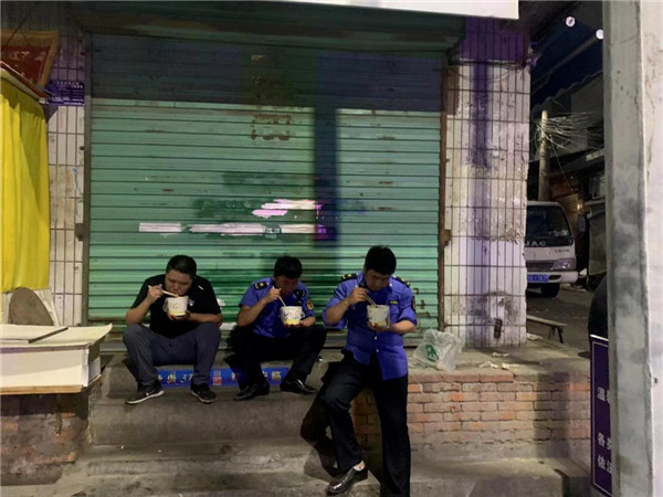 辦事處“兩違”隊(duì)員不怕苦,不怕累,從下午4點(diǎn)一直“戰(zhàn)斗”到凌晨四點(diǎn),餓了就蹲在路邊的臺(tái)階上胡亂“扒口飯”,累了就坐在地上短暫“歇口氣”,盡管汗水浸透了衣衫,依然抓緊“手頭活”。“晚上趕緊干完,不然白天這得堵個(gè)水泄不通。”大家互相鼓氣加油。