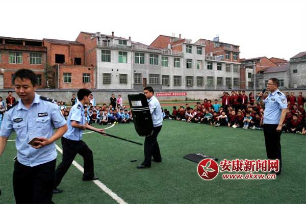 在活動(dòng)過(guò)程中,該所副所長(zhǎng)陳小兵先進(jìn)行了法律知識(shí)講座。講座中,陳所長(zhǎng)針對(duì)青少年犯罪的性質(zhì)、特點(diǎn)、根源,結(jié)合青少年的生理、心理特征,以生動(dòng)的事例,詳實(shí)的資料,通俗的語(yǔ)言,解讀了一個(gè)個(gè)觸目驚心的青少年犯罪案例,給學(xué)生上了一堂生動(dòng)的法制教育課。緊接著公安民警又向師生們展示了催淚噴射器、警棍、鋼叉、阻車(chē)器等警用裝備并模擬在遇到壞人時(shí)應(yīng)如何正確使用這些警用裝備以便最迅速、有效地將壞人制服,師生們聽(tīng)得聚精會(huì)神,博得了師生的陣陣掌聲!