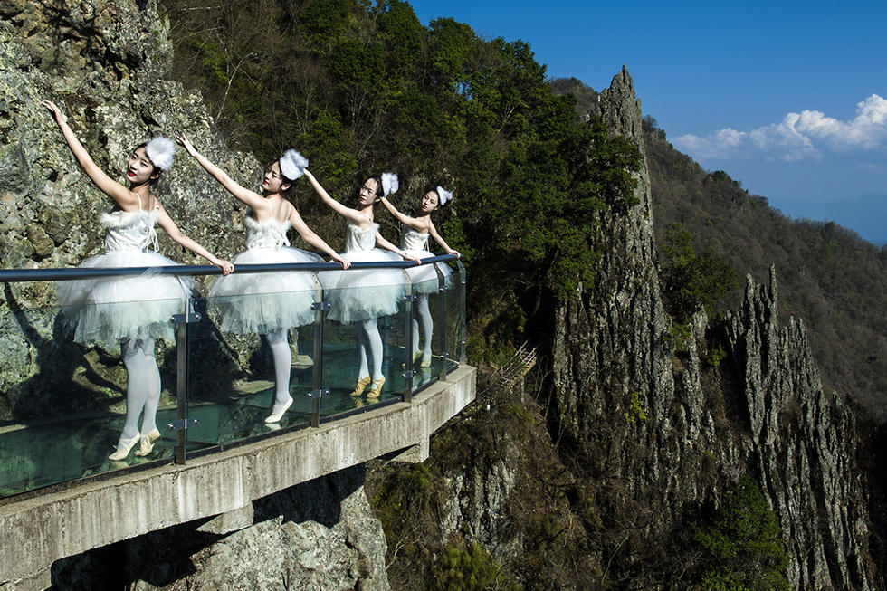 在懸崖絕壁的玻璃棧道上,芭蕾演員們身著潔白的芭蕾服,腳踩透明玻璃,隨著音樂的響起,她們跳出各種唯美的芭蕾舞動作。美麗險峻的山峰,輕巧婀娜的舞姿,將空中芭蕾與山的險奇有機(jī)結(jié)合,給春天里的南宮山再添了幾分美景。達(dá)人們紛紛走到玻璃棧道,用手中的相機(jī)留念拍照,與粉絲們暢談著 “空中漫步”,低頭俯瞰綿延山川的絕色美景。