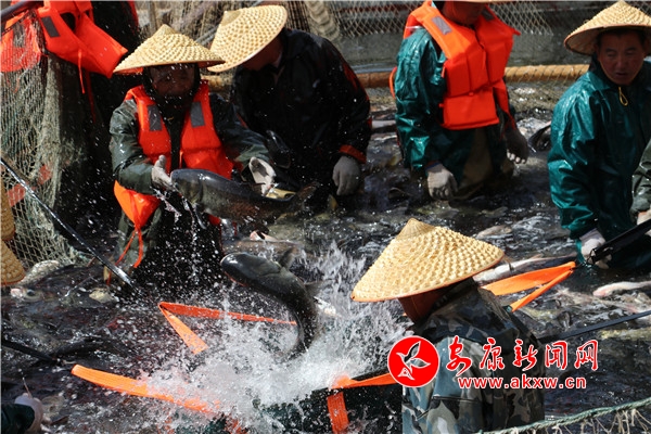 本網(wǎng)訊(通訊員 廖霖 楊敏麗 邱萌 )一條條肥美碩大的花鰱和白鰱歡騰雀躍,在一張張大網(wǎng)的包裹下被捕撈上岸。網(wǎng)中魚(yú)兒蹦蹦跳,岸上漁民彎腰笑,水花四濺,魚(yú)兒歡騰繪制出了一幅“魚(yú)躍人歡漁家樂(lè)”的精美畫(huà)卷。連日來(lái),嵐皋縣嵐宮湖水庫(kù)生態(tài)魚(yú)養(yǎng)殖基地呈現(xiàn)出水清魚(yú)肥,魚(yú)肥民富的動(dòng)人景象。