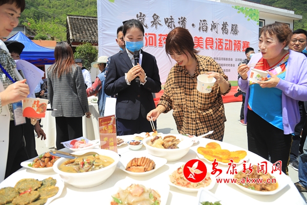 暢游清幽藥谷之鎮(zhèn),品嘗農家藥膳美食。活動現場,人潮涌動,十分熱鬧。山藥燒排骨、槐花雞蛋、青蒿牛肉餅、香酥芍藥花、蠻子藥炒雞蛋……一道道現場烹飪制作的美食,極具本土特色,令人垂涎三尺……讓人“食”指大動,引得近千名村民和外地游客“味蕾大開”,爭相品嘗,舌尖上的鄉(xiāng)愁和美景第一次在這個四月深刻交融。