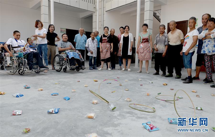 寧陜縣中心敬老院五保失能托養(yǎng)中心內(nèi),托養(yǎng)人員在一起進(jìn)行套圈游戲(8月20日)。 自2016年9月起,陜西寧陜縣開始實(shí)行貧困失能、半失能人員集中供養(yǎng),為其提供干凈舒適的住所、24小時全面護(hù)理,不僅讓貧困失能、半失能人員得到良好照料,也徹底將失能家庭解放出來,全身心脫貧致富奔小康。目前,寧陜登記在冊貧困失能、半失能人員共有467人,其中320人已分別在全縣4個敬老院的五保失能托養(yǎng)中心內(nèi)進(jìn)行集中供養(yǎng),剩余人員將于托養(yǎng)中心床位逐步完善后全部入住。 新華社記者 劉瀟 攝