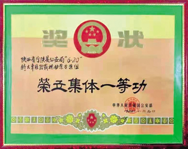 和往常一樣,我正和管理檔案的陳姨一起整理資料,忽然被眼前一塊榮立集體一等功的獎狀吸引,仔細查看,發(fā)現(xiàn)上面的詳細內容是:陜西省寧陜縣公安局“6.20”特大車匪路霸搶劫案專案組榮立集體一等功,落款是中華人民共和國公安部,時間是1995年8月9日。