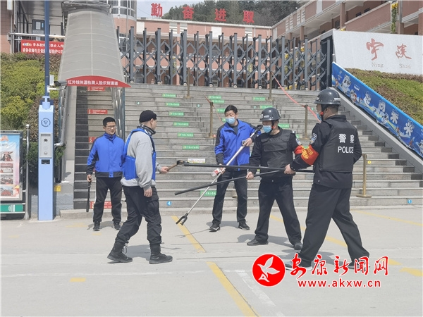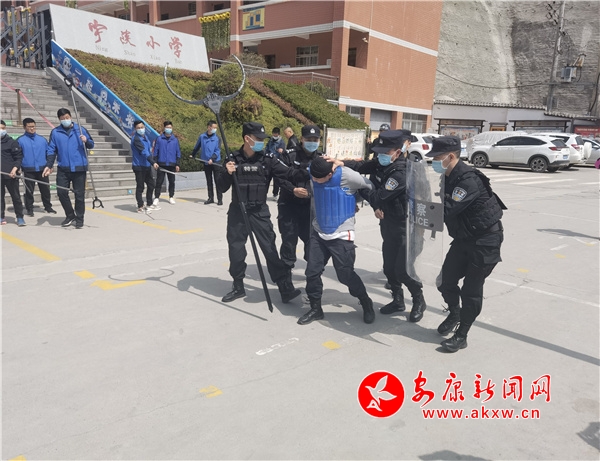 演練開始,下午1點30分,入校音樂響起,兩名校警、家長護(hù)衛(wèi)隊、值班老師站在校門口執(zhí)勤,大部分學(xué)生已進(jìn)入校園,還有十幾名學(xué)生正在排隊等待入校。此時,在學(xué)校旁邊閱讀吧門口徘徊的一名身份不明的“歹徒”突然舉著砍刀沖向校門口,企圖闖入校園,值班校警見狀立即啟動一鍵式報警向公安部門求助,值班老師快速做出反應(yīng),拉響學(xué)校警報,關(guān)閉伸縮門,組織未入校的學(xué)生趕往緊急避難場地躲避。同時,校警和值班老師手持器械,在校門口對“歹徒”進(jìn)行阻擊,拖延時間。
