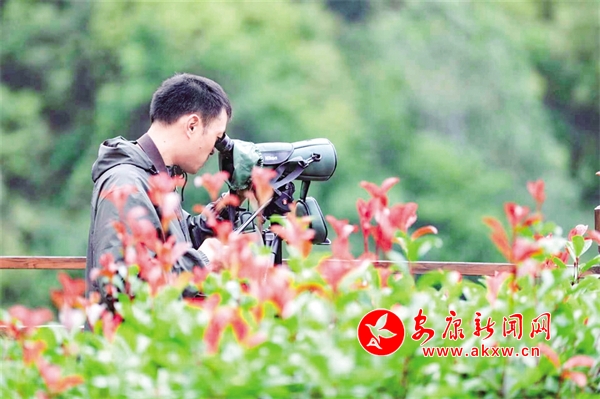 李夏利用專業(yè)望遠(yuǎn)鏡觀察朱鹮