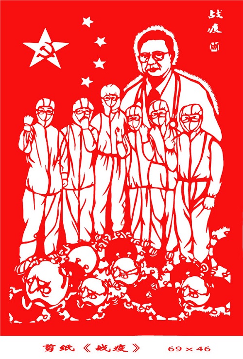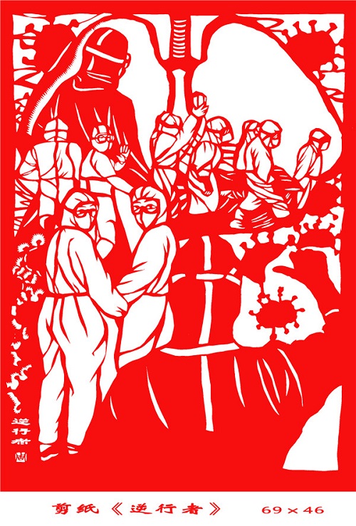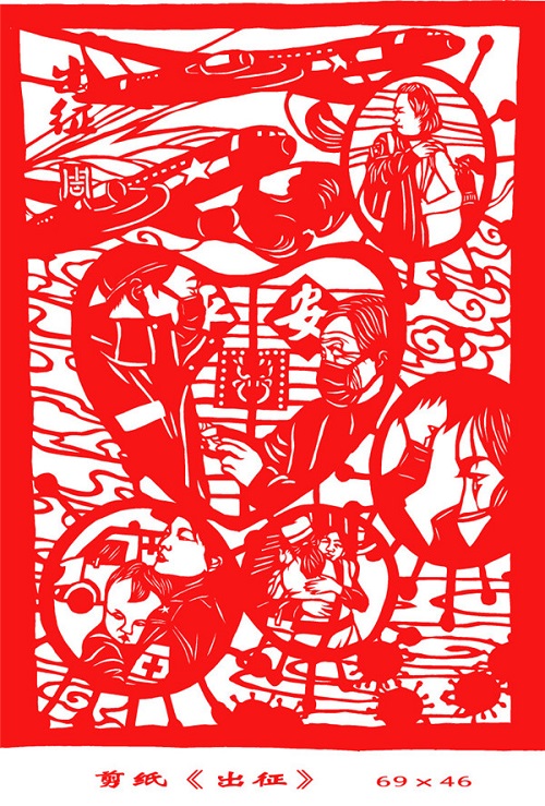 周玉珍作為安康市平利縣的一名小學(xué)美術(shù)教師,在做好學(xué)生、家長疫情防控宣傳教育的同時,戰(zhàn)“疫”中的許多瞬間,令她分外感動。她借個人居家防護(hù)的時機(jī),完成了《出征》《逆行者》《戰(zhàn)疫》三幅剪紙作品,用鮮紅的剪紙記錄下了那些令人感動的瞬間。