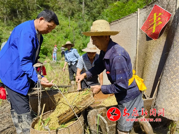 在簡短的開鐮儀式后,水稻收割正式開始,紅黃兩隊競相角逐。只見金黃的稻田中,村民手持鐮刀一字排開,迅速揮舞著手中的鐮刀,將金黃的稻秧割下并整齊堆放。緊接著兩人一組,交叉替換地將手中的稻秧在拌桶里反復(fù)甩打脫粒,拌谷聲“嘣嘣嘣嘣”有節(jié)奏的作響,一片豐收景象,聲勢頗為壯觀。