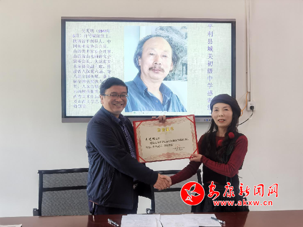 本網(wǎng)訊(通訊員 黃燕)3月18日,平利縣城關(guān)初級(jí)中學(xué)舉辦“中國(guó)畫壇百杰、平利籍畫家吳光明”書畫作品捐贈(zèng)儀式。吳光明委托其外甥女王小茜將《黃河的傳說》《天柱地軸》《恒山深處多仙家》等11幅作品捐給城關(guān)初級(jí)中學(xué)。