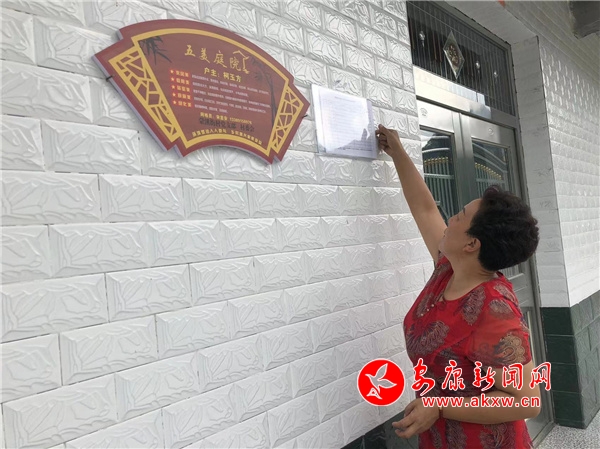 四組宋立琴一大早就拿著大掃帚清掃院落,潔凈的玻璃窗倒映著笑臉,與大門上懸掛著的“五美庭院”相得益彰。環(huán)顧四周,宋立琴周邊農(nóng)戶都懸掛著同樣的“五美庭院”標識。