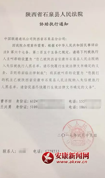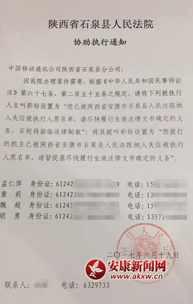 6月19日下午,石泉法院將首批需要進(jìn)行通信限制的11名“老賴”名單提供給了三大通信公司,要求其協(xié)助執(zhí)行。