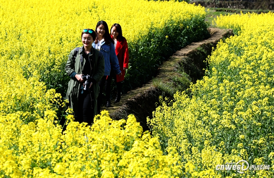游客行走在油菜花田間