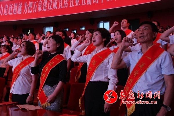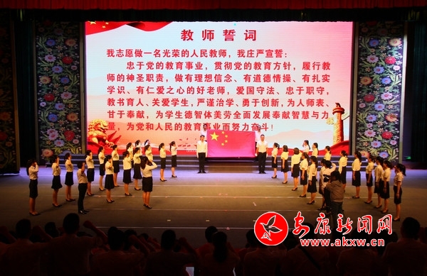 演出現(xiàn)場,對石泉中學等10 個“一流教育質量單位”,李超旗等10名一流學校校長,陳興蘭等30名“一流教學能手”,楊細雨等50 名“三愛標兵”進行了表彰獎勵,2019年新入職的教師代表進行了宣誓,老教師重溫了誓詞。