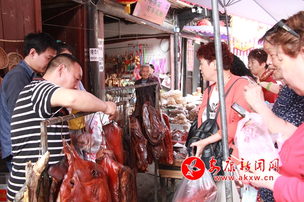 在古街中段,有兩間不大的老式建筑門面,門面掛著一個刻有“千年奇石萬年崖柏”的牌匾。店內(nèi)的貨柜貨架上陳列著奇石、崖柏、文玩等工藝品,而在店門口卻整齊地擺列著各種土特產(chǎn),一個橫架子上掛滿了臘肉、香腸,正是這些不起眼的干貨、臘肉吸引了游客圍著一圈駐足品嘗購買。
