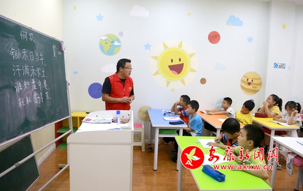 8月14日,石泉縣池河鎮(zhèn)西苑社區(qū)大學(xué)生志愿者正在為暑期免費(fèi)輔導(dǎo)班學(xué)生講解《憫農(nóng)》,教育孩子們勤儉節(jié)約。孩子們通過講解父母或自己參與勞作的感受,體會了“汗滴……
