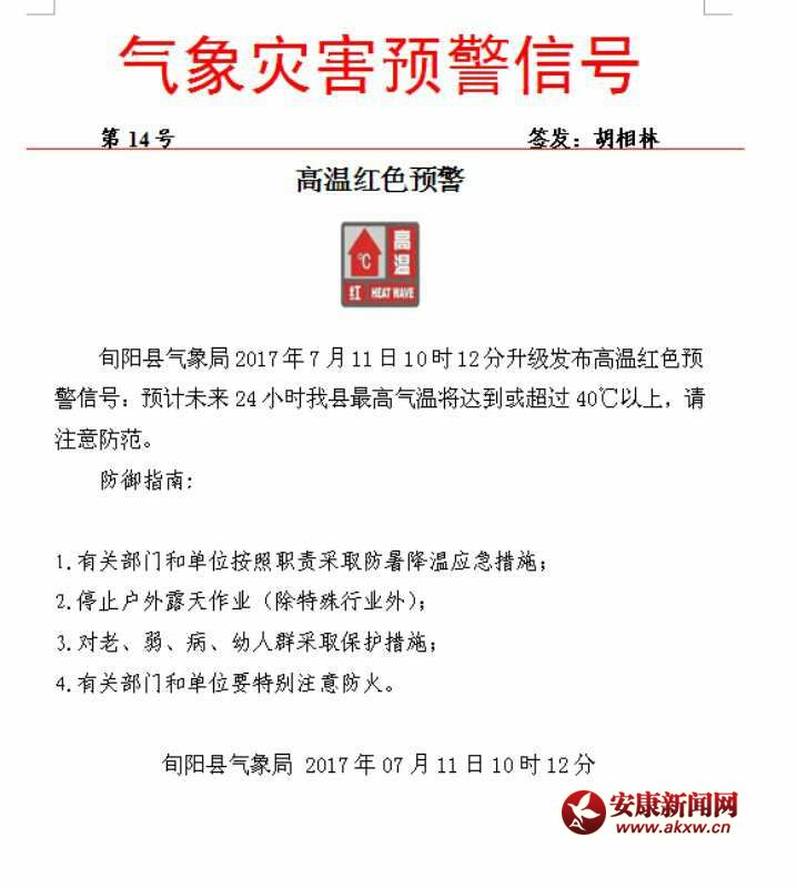 安康新聞網(wǎng)訊(通訊員 錢夢莉)旬陽縣氣象局2017年7月11日10時12分升級發(fā)布高溫紅色預(yù)警信號:預(yù)計未來24小時我縣最高氣溫將達到或超過40℃以上,請注意防范。