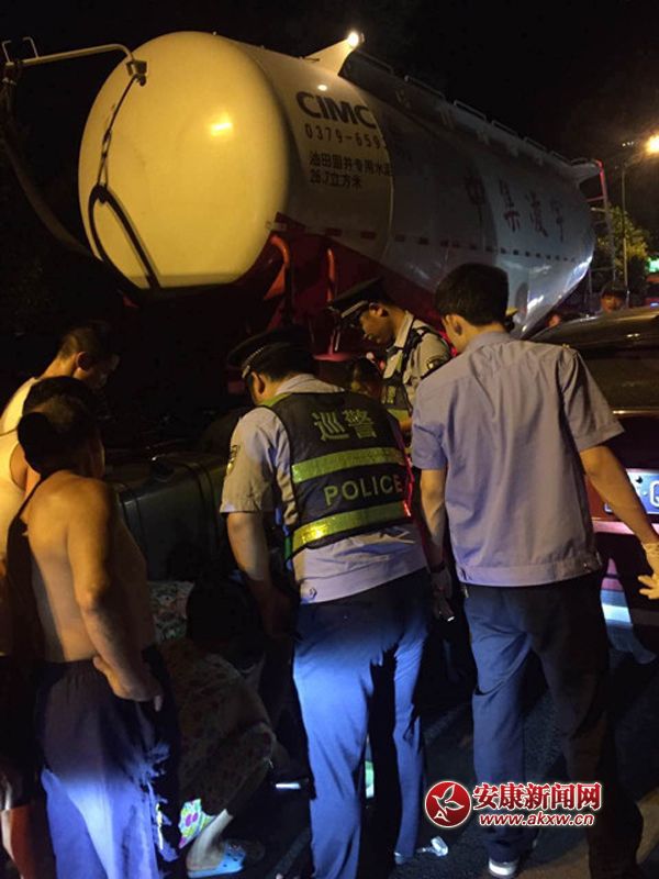 7月21日晚23時(shí)許,旬陽(yáng)縣公安局巡警大隊(duì)康華園巡邏民警接到過(guò)路的群眾報(bào)警,稱(chēng):城區(qū)周家溝附近有交通事故,可能有人受傷。民警立即趕往事發(fā)地點(diǎn),沿途發(fā)現(xiàn)交通以堵塞,長(zhǎng)長(zhǎng)的車(chē)隊(duì)一眼望不到頭,趕到事發(fā)地點(diǎn)后,發(fā)現(xiàn)一油罐車(chē)車(chē)底躺著兩個(gè)人,一男一女系夫妻關(guān)系,女子的腿部受傷嚴(yán)重,不能移動(dòng),當(dāng)民警趕到現(xiàn)場(chǎng)后,交警以及救護(hù)車(chē)隨后趕到,巡邏民警配合救護(hù)人員將躺在油罐車(chē)下的兩人救出,及時(shí)送往醫(yī)院救治。