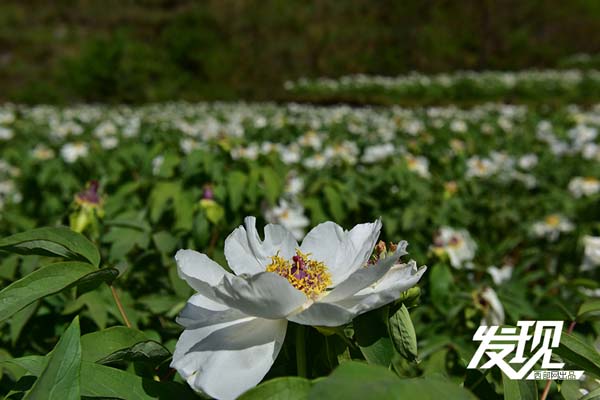 四月,圍繞水泉坪的梯田上綻放著潔白的牡丹花。