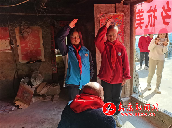 在兩位黨員教師的攙扶下,老人家從室內(nèi)來到了院子里,少先隊(duì)員代表為老英雄獻(xiàn)上鮮艷的紅領(lǐng)巾,表達(dá)隊(duì)員們心中崇高的敬意。