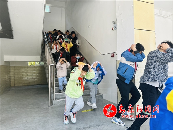 片刻之后,要求師生疏散撤離教學樓的指令發(fā)出,各班學生在老師的組織下沿指定路線撤離。行進中,大家降低身體重心躬身前行,有的用雙手捂住頭部,有的用書本遮蓋頭頂,以最快的速度向安全疏散點轉移,整個疏散撤離過程快速而有序,僅用時1分40秒,600余名師生便安全撤離至學校操場,實現(xiàn)了預期演練目標。