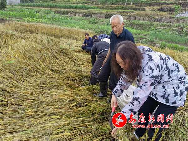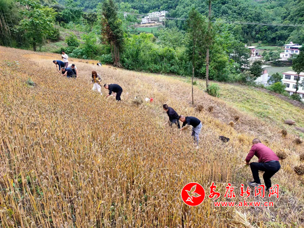 “大家再加把勁兒,這一塊馬上要收割完了,完了我們轉(zhuǎn)戰(zhàn)老李家。”在黑溝村二組石槽溝梁利鵬的麥田里,鎮(zhèn)村黨員干部、左鄰右舍與“時間”賽跑,割麥、捆扎、搬運(yùn)……大家分工協(xié)作,動作嫻熟利索、揮汗如雨,不一會兒,五畝小麥全部收割完成。