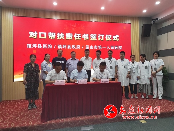 本網(wǎng)訊(通訊員 杜波兒 楊明榮)根據(jù)國家衛(wèi)生計(jì)生委等5部門《關(guān)于印發(fā)加強(qiáng)三級(jí)醫(yī)院對(duì)口幫扶貧困縣縣級(jí)醫(yī)院工作方案的通知》以及《關(guān)于開展2019-2020年蘇陜醫(yī)院對(duì)口幫扶工作的通知》(陜衛(wèi)醫(yī)發(fā)〔2019〕52號(hào))的文件要求,為深入貫徹落實(shí)江蘇、陜西省委、省政府關(guān)于蘇陜對(duì)口幫扶工作,5月25日,鎮(zhèn)坪縣委常委、副縣長蔡小安率鎮(zhèn)坪縣衛(wèi)健局、縣醫(yī)院赴江蘇昆山市第一人民醫(yī)院對(duì)接對(duì)口支援工作,并簽署了對(duì)口支援責(zé)任書。昆山市衛(wèi)健委副主任朱敏等相關(guān)領(lǐng)導(dǎo)參加活動(dòng)并發(fā)表講話。昆山市第一人民醫(yī)院、鎮(zhèn)坪縣衛(wèi)健局、縣醫(yī)院、疾控中心相關(guān)人員負(fù)參加簽字儀式。