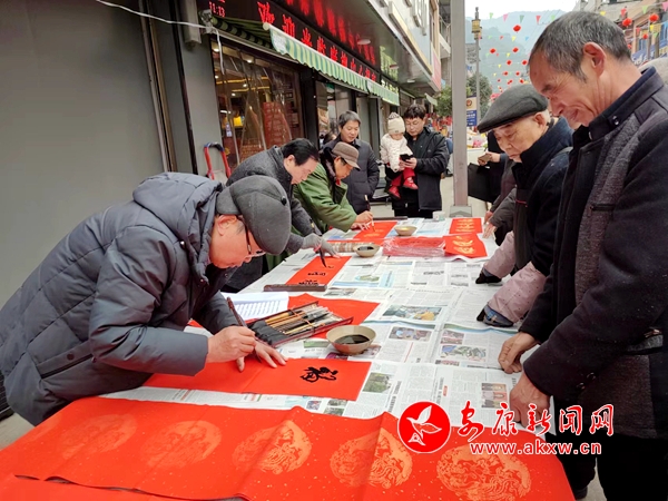 在一長排擺放整齊的寫字桌前,圍滿了來自四面八方的上百名群眾,個個喜氣洋洋,爭先認(rèn)領(lǐng)自己心儀的過年春聯(lián)。“春回大地龍翔九天,福滿人間鳳舞五福。橫批:龍年行大運”。一幅幅吉祥喜慶、一句句恩澤華夏的美好祝愿被老百姓爭先領(lǐng)取。