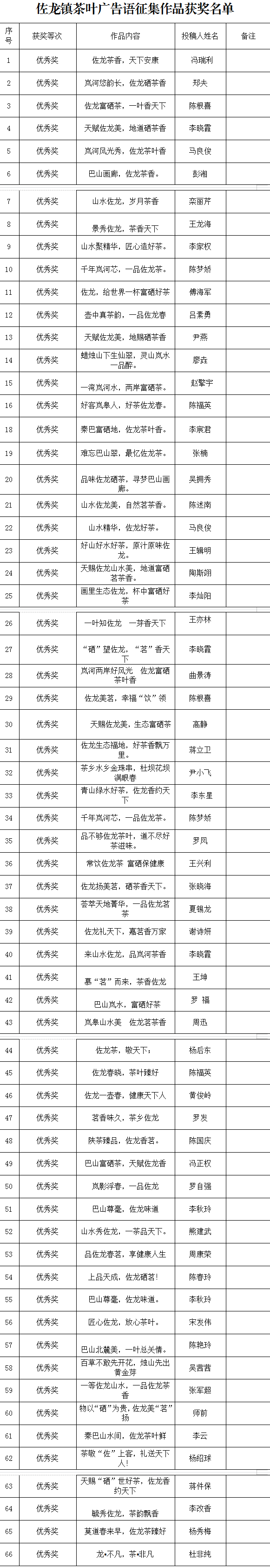 嵐皋縣佐龍鎮(zhèn)黨委、鎮(zhèn)政府在安康日報、安康新聞網(wǎng)發(fā)布《佐龍鎮(zhèn)有獎?wù)骷枞~公用品牌名稱及廣告語公告》以來,得到社會各界人士的積極響應(yīng)和支持。本次收集到的所有作品,佐龍鎮(zhèn)安排專人逐一按時間順序統(tǒng)一排序備選,經(jīng)組委初選、專家評選,已評選出獲獎作品擬予以獎勵,現(xiàn)將擬獲獎名單進(jìn)行公示,其中一等獎2名,二等獎3名,三等獎5名,優(yōu)秀獎66名,公示時間自發(fā)布之日起至2021年12月31日17時。擬獲獎名單如下: