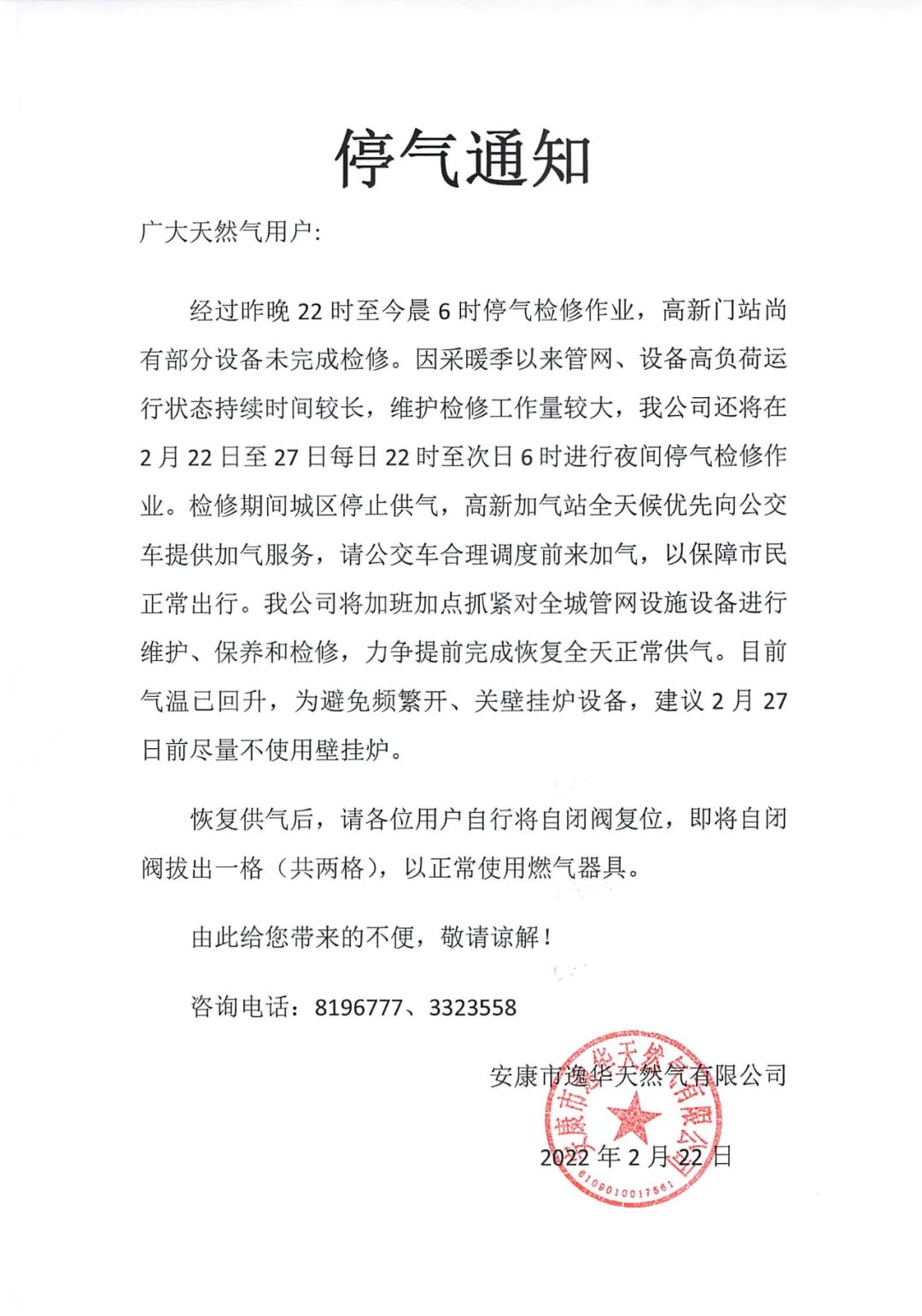 2月22日至27日每日22時至次日6時,城區(qū)停止供氣