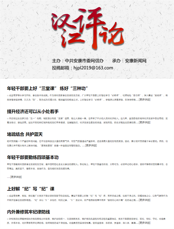 三是圍繞省委、市委“三個年”活動部署,網(wǎng)站開設“一把手開麥——聚焦‘三個年’”專欄,聚焦我市“高質(zhì)量項目推進年、營商環(huán)境突破年、干部作風能力提升年”主題報道,為推進安康高質(zhì)量項目發(fā)展、助力擦亮“營商環(huán)境最安康”金字招牌、提升全市干部作風能力,營造濃厚良好輿論氛圍。