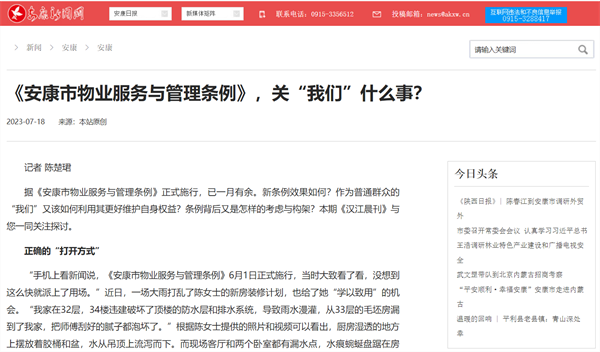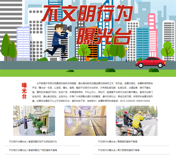 安康新聞網(wǎng)履行媒體輿論監(jiān)督職能,聚焦民生熱點,開辦《不文明行為曝光臺》輿論監(jiān)督專欄,集中曝光身邊的不文明現(xiàn)象、行為,引導市民群眾自覺規(guī)范文明行為,主動融入城市文明創(chuàng)建熱潮,為提升市民文明素質(zhì)和城市文明程度貢獻媒體力量。同時,聚焦群眾關切,積極開展調(diào)查性報道,發(fā)布《〈安康市物業(yè)服務與管理條例〉關“我們”什么事?》等一批原創(chuàng)新聞,還原事件真相,及時宣講與群眾生活息息相關的最新政策條例,體現(xiàn)地方黨媒的責任與擔當。