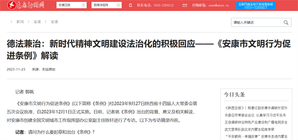 2023年,安康新聞網(wǎng)站準確刊播政策消息,保證了政務消息、惠民消息及時準確地傳播。發(fā)揮黨媒資源優(yōu)勢,準確闡釋解讀市委、市政府的重要決策和惠民政策,刊出《德法兼治:新時代精神文明建設法治化的積極回應——〈安康市文明行為促進條例〉解讀》《安康市2023年義務教育階段學校招生入學政策解讀》,從群眾關切入手,提升媒體服務質(zhì)量和為民服務意識。