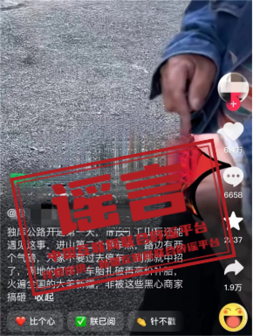 真相:據(jù)新疆文化和旅游廳官方微信公眾號消息,獨庫公路已于6月1日10時正式通車。近日,網(wǎng)傳一則“獨庫公路亂撒釘子,商家補(bǔ)胎賺錢”的視頻內(nèi)容,引發(fā)網(wǎng)民關(guān)注。經(jīng)新疆烏蘇市公安局調(diào)查核實,視頻反映的事發(fā)地處于獨庫公路K599路段,為保障通行安全,公路有關(guān)部門已對該路段進(jìn)行巖壁防護(hù)網(wǎng)加固工作。視頻中現(xiàn)場釘子來源為施工方拆卸固定模具板材時散落的舊釘子,且根據(jù)現(xiàn)場排查,周邊并無汽車輪胎維修點位。視頻發(fā)布者的車胎并未被釘子扎破,亦不存在高額補(bǔ)胎的情況。(來源:“新疆網(wǎng)絡(luò)辟謠”微信公眾號)