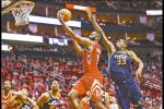 當(dāng)?shù)貢r間11月5日,火箭隊球員哈登(上左)在比賽中突破上籃。當(dāng)……