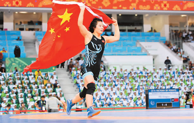 9月25日,在第五屆室內(nèi)與武道運動會自由式摔跤女子58公斤級比賽中,中國選手裴星茹以3比1戰(zhàn)勝吉爾吉斯斯坦選手德內(nèi)別科娃,獲得金牌。圖為裴星茹身披國旗慶祝勝利。HPD安康新聞網(wǎng)