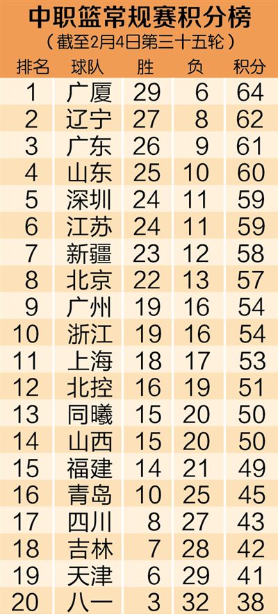 2017—2018賽季中國男籃職業(yè)聯(lián)賽(CBA)常規(guī)賽還剩3輪,暫居積分榜首位的浙江廣廈隊目前領先第二名遼寧隊兩個勝場,處在沖擊常規(guī)賽冠軍更有利的位置;而圍繞季后賽席位的爭奪更趨白熱化,3支球隊為最后兩個席位發(fā)起最后的沖刺。