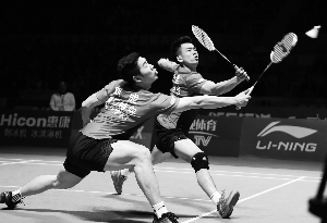 廈門特房隊劉成、鄭思維(右)在男雙比賽中。 本報記者 王憲民攝