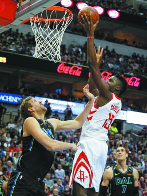火箭隊球員卡培拉(上)在比賽中上籃! ⌒氯A社/美聯(lián)
