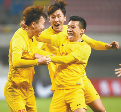 3月21日,中國足協(xié)U21(21歲以下)選拔隊(duì)球員吳偉(左)進(jìn)球后與隊(duì)友慶祝。R2L安康新聞網(wǎng)