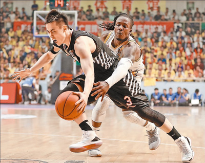 4月17日,遼寧隊(duì)球員趙繼偉(左)突破廣廈隊(duì)球員福特森的防守。