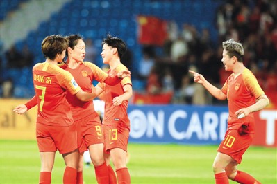 | 中國隊(duì)球員唐佳麗(左二)進(jìn)球后和隊(duì)友慶祝。 |