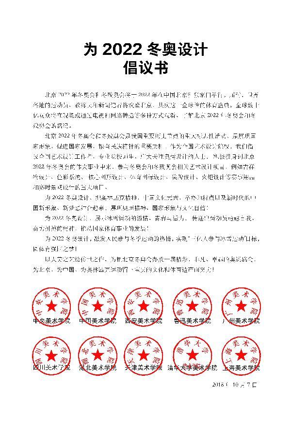 ↑中央美術(shù)學院、中國美術(shù)學院等十所全國各地美術(shù)學院7日在北京共同發(fā)出“為2022冬奧設計”的倡議,號召大家積極投身到北京2022年冬奧會相關工作中來,參與冬奧會和冬殘奧會相關藝術(shù)設計項目中。圖為倡議書,由中央美術(shù)學院提供。